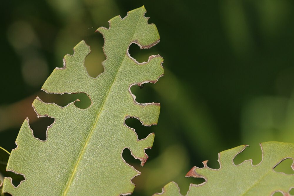 - Blaadjes met gaten, aangevreten door een kever, rups of een slak.