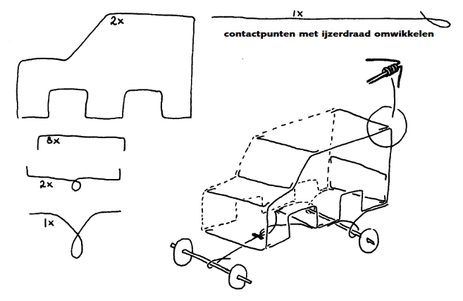 Je buigt het ijzerdraad in de vormen die hieronder staan weergegeven. Vergroot de vormen eventueel op een kopieerapparaat om grotere auto’s te maken. Bij de vormen staat aangegeven hoeveel je van elk nodig hebt. Je maakt de verschillende vormen met ijzergaren of stevig draad aan elkaar vast. Let hierbij op de plaatsen die op de tekening zijn aangegeven.