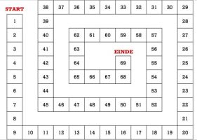 De groepen mogen om beurten met de dobbelsteen gooien. Zoveel vakjes mag je dan vooruit gaan met je pion. Je moet dan afhankelijk van wat er op het bord staat een opdracht uitvoeren of niet. Als je een opdracht wint krijg je een punt. Als je twee keer na elkaar hetzelfde getal gooit dan moet je een beurt wachten. Als er iemand op het einde geraakt dan is het spel gedaan en dan kijken we wie de meeste punten heeft en gewonnen is.