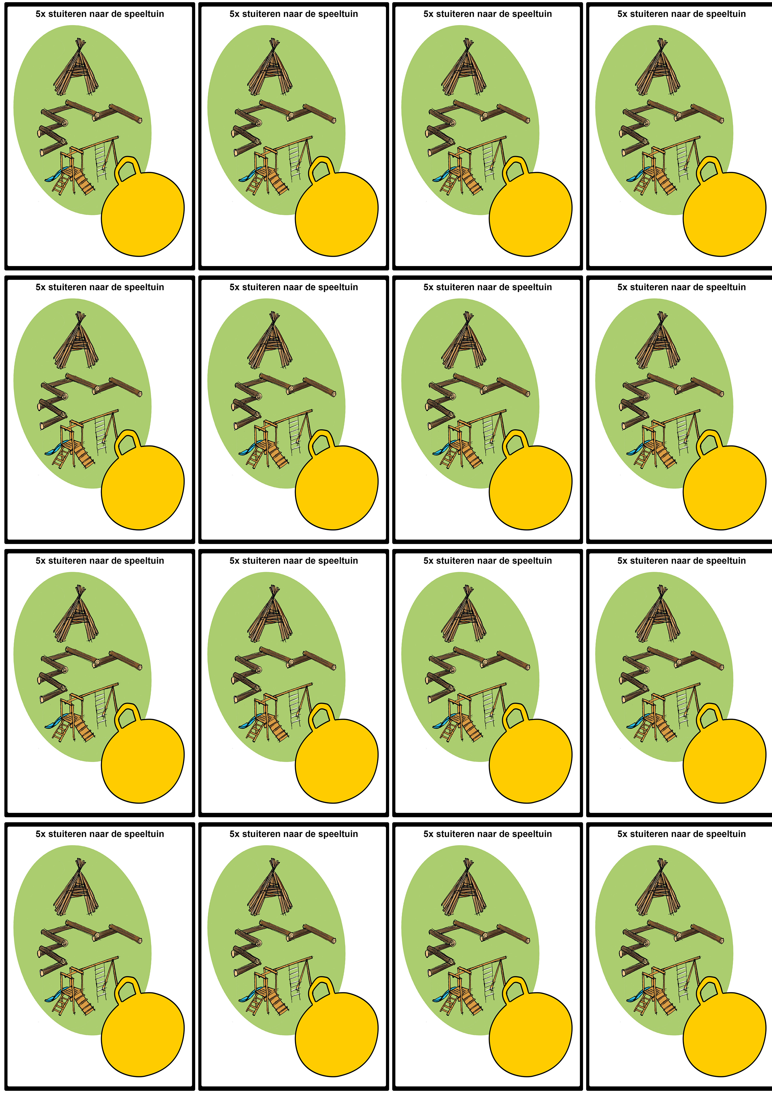 - '5x stuiteren naar het speelveld' (8x nodig, 24 kaartjes in totaal)