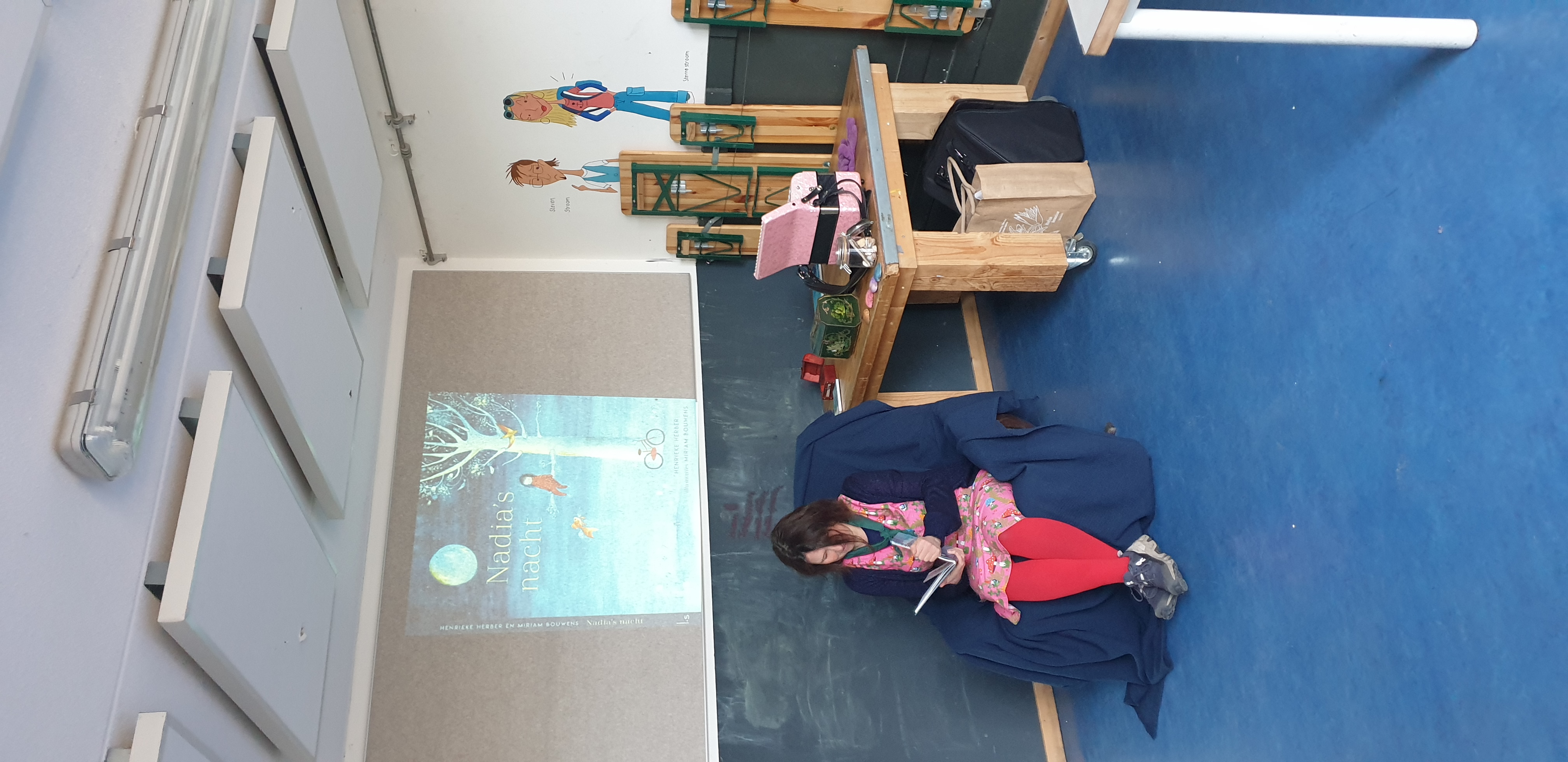 Wij hadden het geluk dat de schrijfster bij ons op bezoek kwam om de verhalen voor te lezen. We hadden een mooi voorleeshoekje gemaakt en de plaatjes uit het boek via een beamer op de muur gepresenteerd.