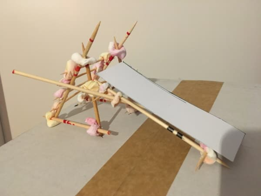 Zorg dat je als leiding een mini-glijbaan hebt gemaakt van tandenstokers, satéprikkers en stukjes spek. De leiding heeft de glijbaan ook in het groot gebouwd, dat komt later.