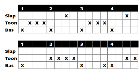 Hieronder vind je een paar voorbeelden. In het onderstaan de schema gaan we uit van een vierkwartsmaat. Je begint met je sterkste hand. Ben je rechtshandig, dan begin je dus met rechts. Je blijft doortellen en je geeft de ‘slag’, die bij het kruisje aangegeven staat. Staat er geen kruisje, dan geef je een denkbeeldige slag, je slaat dus niet! In het voorbeeld hiernaast dus: rechts bas, links toon, rechts toon, links toon, rechts bas, links niets, rechts slap, links niets enz