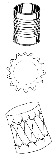Eerst haal je de boven- en onderkant uit het blik. Gebruik een vijl om de scherpe randen weg te werken. Hierna knip je twee stukken uit de binnenband, groter dan de opening van het blik. Zie de tekening voor de vorm. Maak gaatjes in de randen van het rubber en leg het rubber over de openingen van het blik. Gebruik het koord om het rubber op te spannen. Zorg dat het goed strak zit, dan krijg je het mooiste geluid. Hierna kun je natuurlijk het blik beplakken of beschilderen.