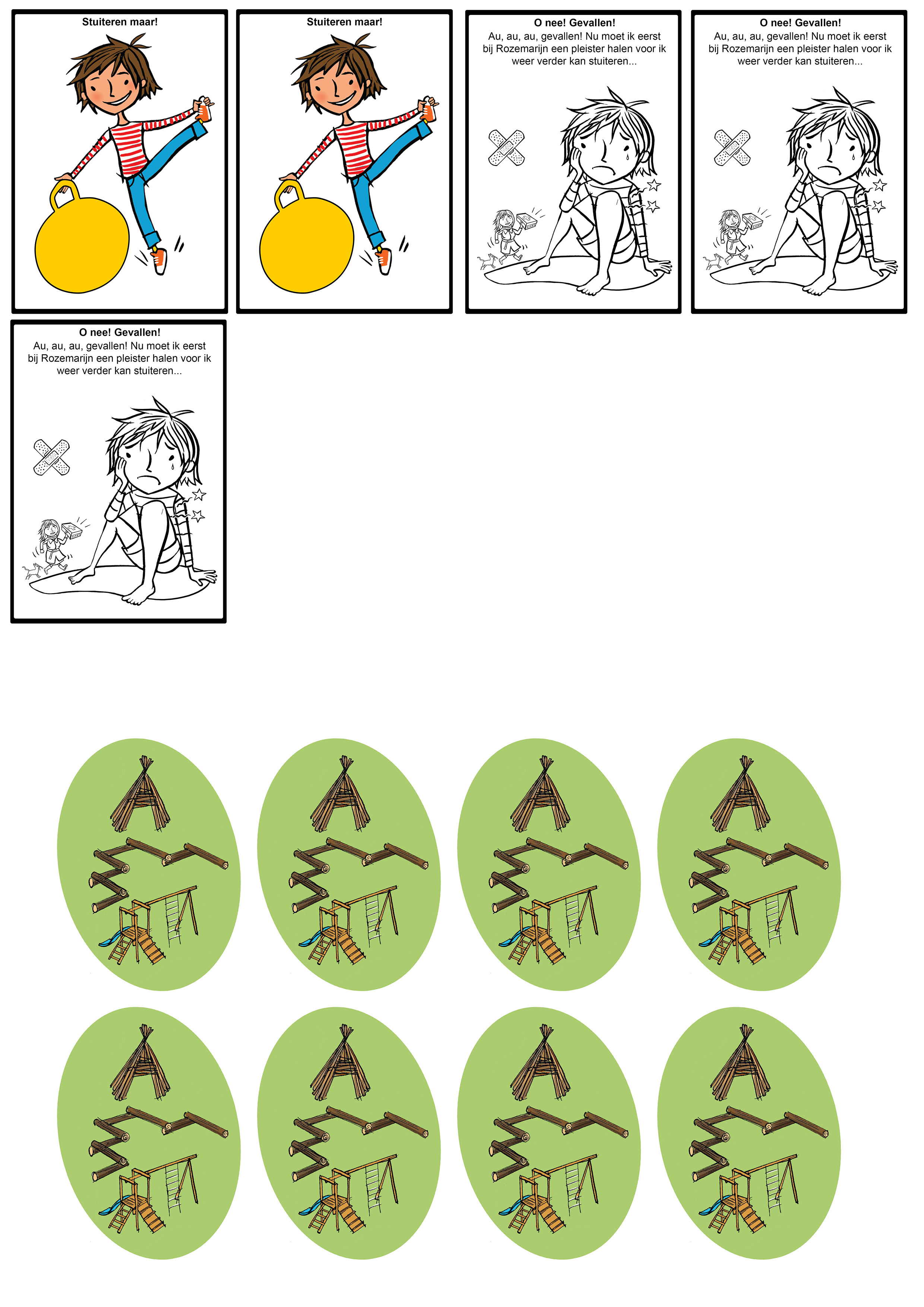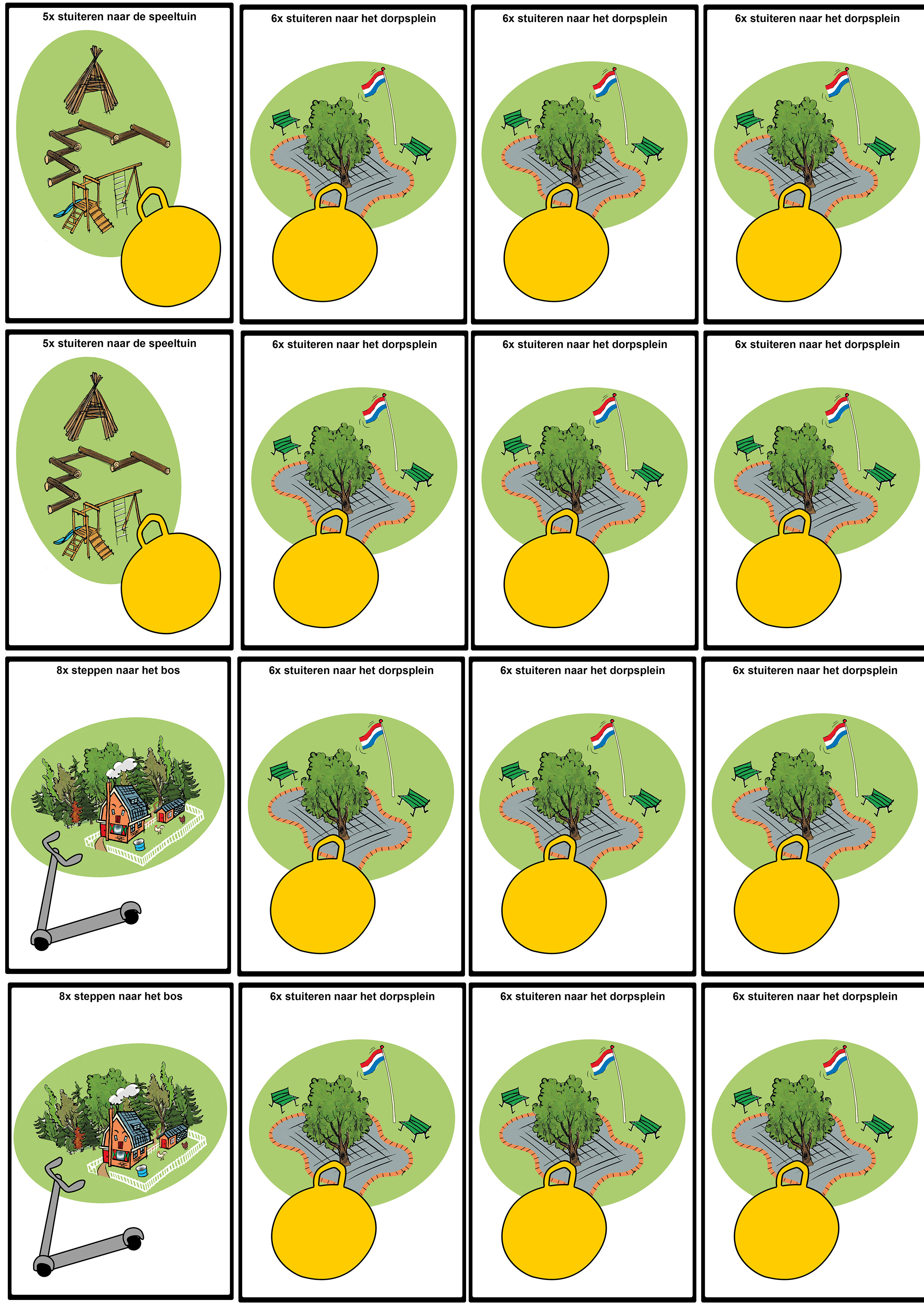 - '6x stuiteren naar het dorpsplein' (4x nodig, 12 kaartjes in totaal)
