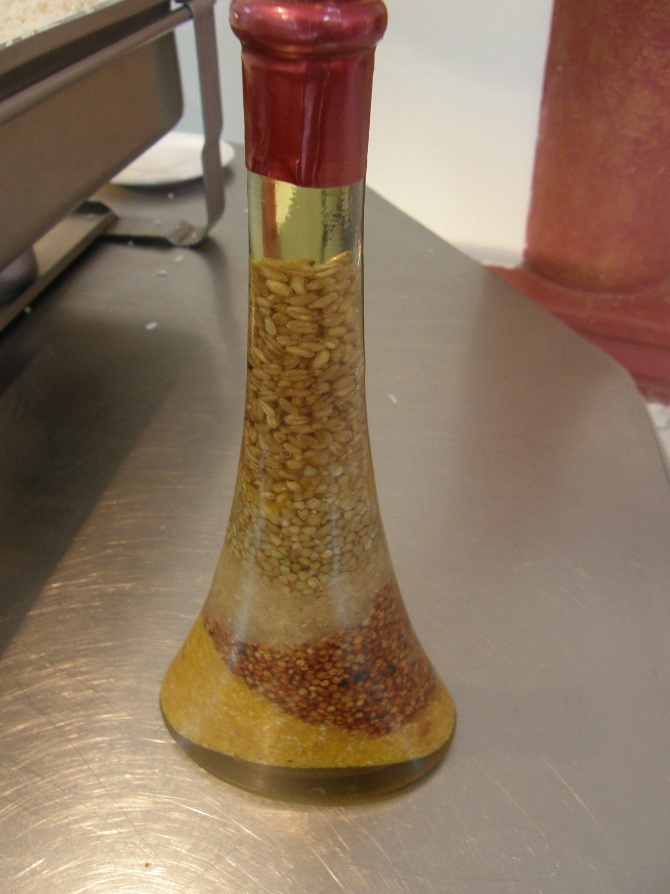 - In een grotere fles kun je ook kleine zaden en peulvruchten gebruiken: gele rijst, groene spliterwten, oranje linzen enzovoorts. Dan krijg je zoiets als resultaat. Dit is meer geschikt voor jongere kinderen en voor kinderen met minder goed ontwikkelde fijne motoriek.